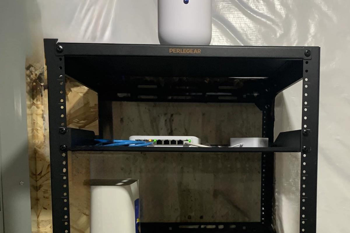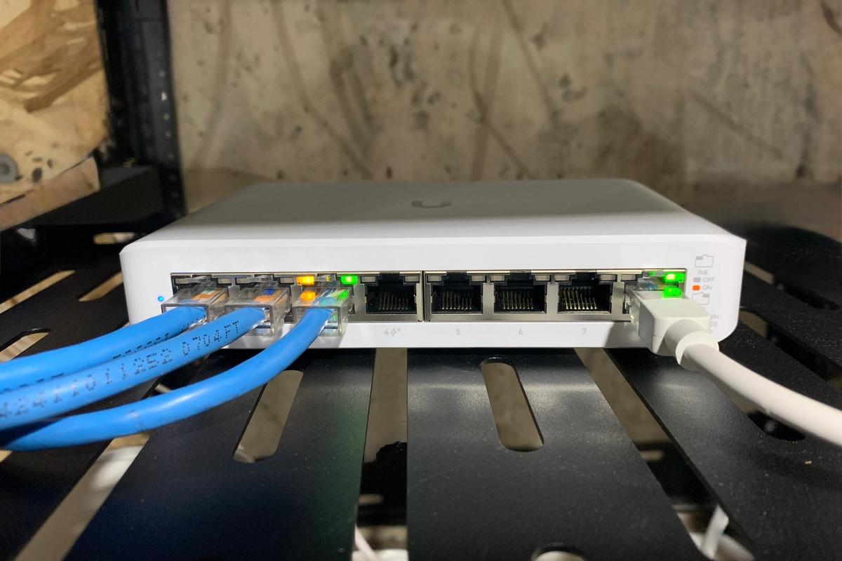 - Network rack installation with Ubiquiti gateway, PoE switch and wireless access points